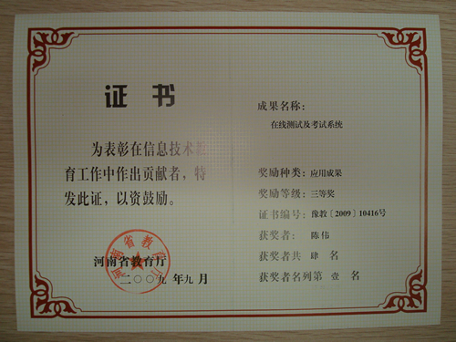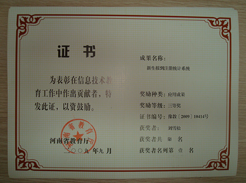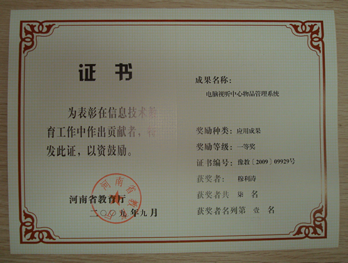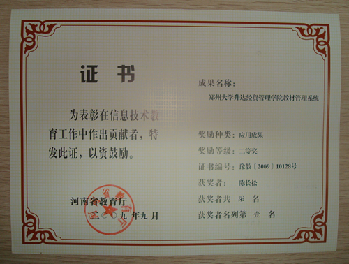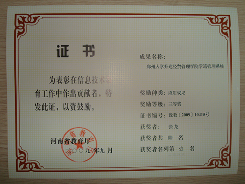 2009年度河南省信息技术教育优秀成果奖日前揭晓。我院现代教育技术中心申报的应用类成果获得了一、二、三等奖。其中《电脑视听中心物品管理系统》荣获应用成果类一等奖、《郑州大学升达经贸管理学院教材管理系统》荣获应用成果类二等奖,《新生报到注册统计系统》、《郑州大学升达经贸管理学院学籍管理系统》荣获应用成果类三等奖。另外,我院资讯系选送的《在线测试及考试系统》也同时获得应用成果类三等奖。