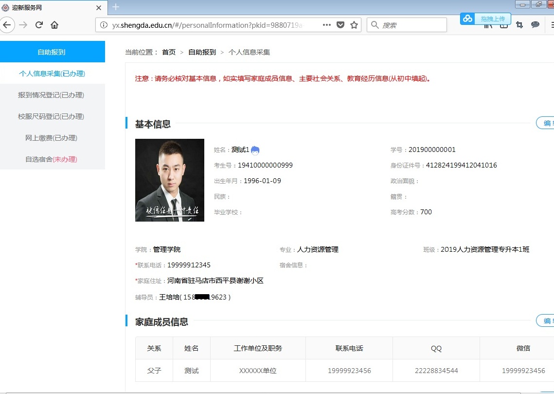 1、个人信息采集:包括联系电话、家庭住址、家庭成员信息、主要社会关系、教育经历信息(初中填起)。其中联系电话、家庭住址等为必填项。在【基本信息】里可查看辅导员信息。