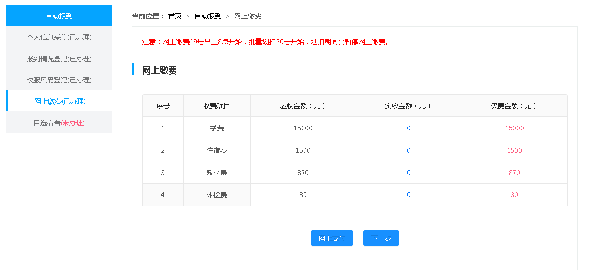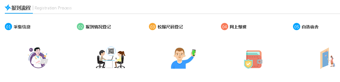 即:【个人信息采集】-【报到情况登记】-【校服尺码登记】-【网上缴费】-【自选宿舍】。