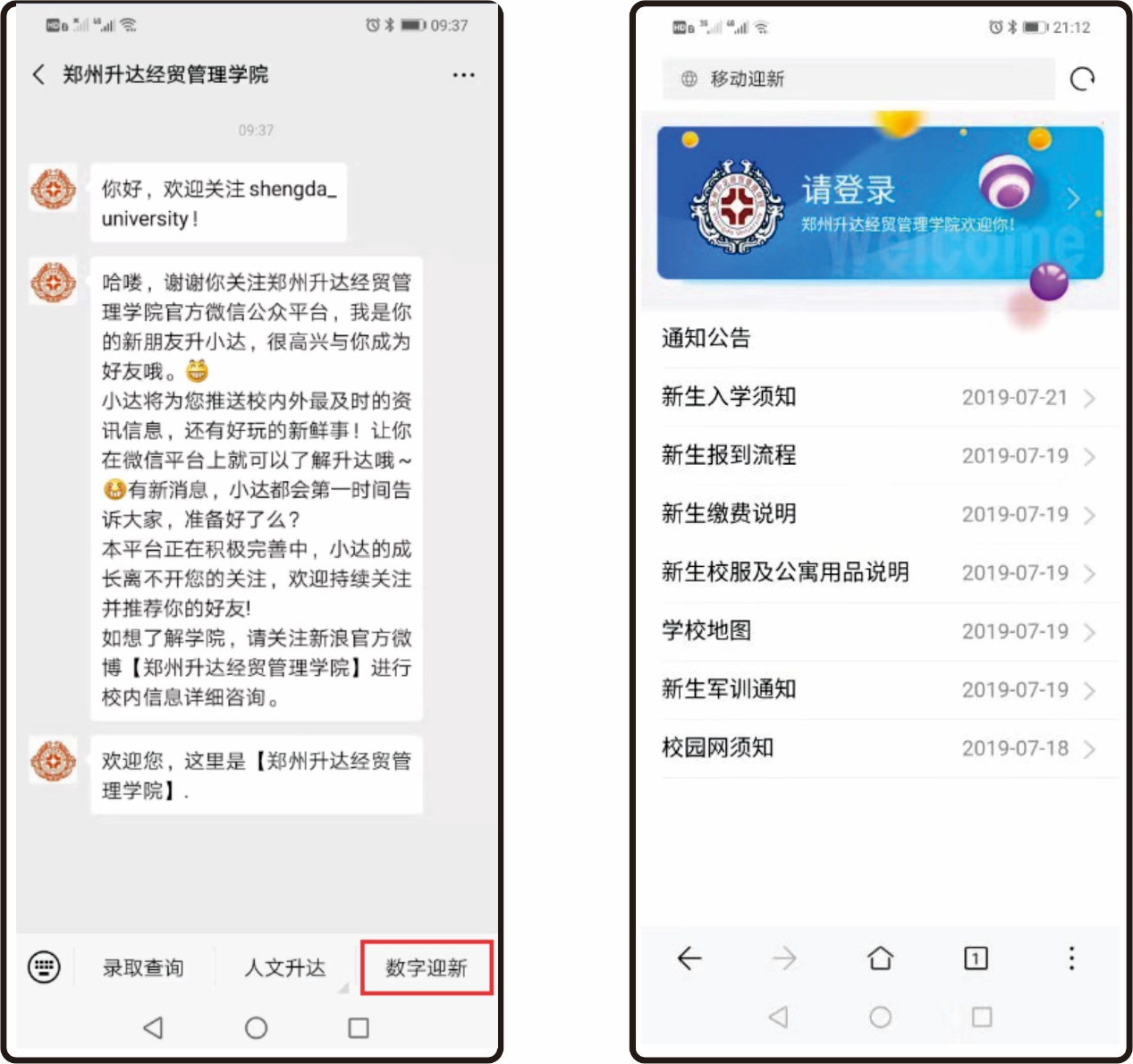 在手机浏览器上直接输入移动端迎新网址,或在学校官方微信公众号菜单栏点击“数字迎新”进入。