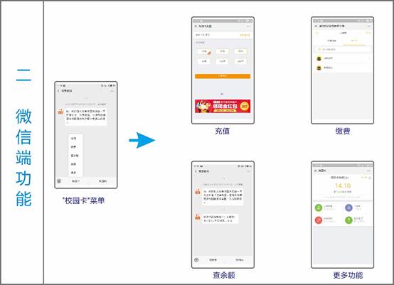 微信关注“完美校园”公众号后,绑定自己的校园卡片,可以在微信上实现校园卡充值、交易查询、余额查询、缴费、挂失、修改密码等功能。