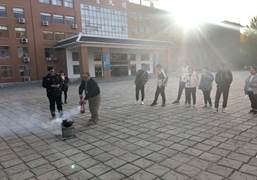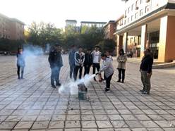 培训结束后,王炎伟教员带领现代教育技术中心和信息化办公室同仁与助理团学生在资讯大楼前空地处进行了消防演练,实际操作灭火器的使用方法。