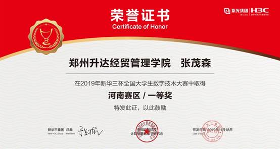 11月10日,2019年新华三杯全国大学生数字技术大赛河南赛区的比赛在郑州信息科技职业学院举行,信息化办公室组织升达网络技术工作室20余名学生参加比赛。近日,初赛成绩公布,参赛学生中共获得5个一等奖、4个二等奖、5个三等奖,其中张茂森同学晋级决赛。