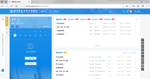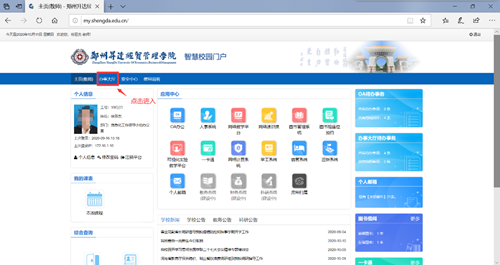 (2)学校首页菜单栏“智慧校园”——登录进入“智慧校园门户”——菜单栏“办事大厅”(默认为个人主页)