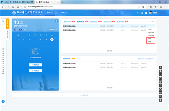 提交后如辅导员未受理可撤回或撤销,办事大厅个人主页,可查看申请进度,如流程未受理,点击右侧省略号图标,有撤回或撤销操作。撤回即退回修改后再次提交,撤销即删除该申请,需重新在办事大厅找到该流程,填写、提交。