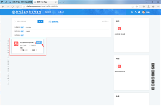 登录办事大厅后,找到“学生医保入保信息确认”,鼠标移至卡片右上角,点击“办理”,打开表单。