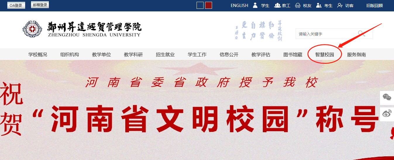 1、打开学校官网首页,点击智慧校园(图1),登录学校统一身份认证平台(图2)。