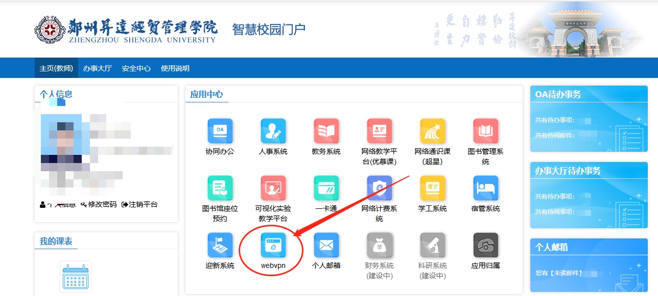 2、在智慧校园门户,应用中心处点击WebVPN图标(图3),即可直接进入到WebVPN系统服务页面(图4)。