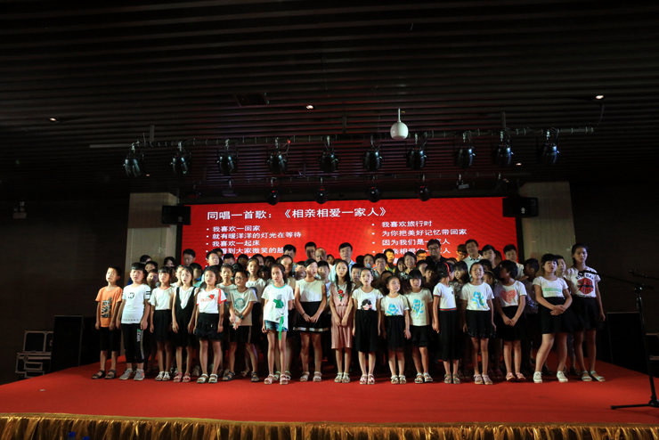在活动成果汇报的最后,在众人期待中迎来一场精彩纷呈的汇报演出。演出的第一幕是本次支教精彩瞬间的视频回顾,一帧帧昨日的画面展现在眼前,或欢乐、或感动,一幕幕都让在场的师生为之动容。而后,歌曲《仲夏的希望》随着悠扬的旋律点亮了在场学生心中的星光。歌舞《离别没有眼泪》后展开了互动环节,支教师生向与会领导赠送了天灯和捕梦网,在写下祝福的话语之后,精美工艺品又回赠给孙洞小学的小学生们,大家祝福满满,感触颇多。尤其是在学生们朗诵《再别洛宁》后,离别的伤感、再别的期待都交织在《仲夏的幸运》这幕表演中,歌曲《有你在不孤单》更是道出了支教师生们彼此的心声。在最后一个节目中,歌曲《相亲相爱一家人》与会领导、与会老师、同学共同唱响,百名师生合影留念,温暖相拥。
