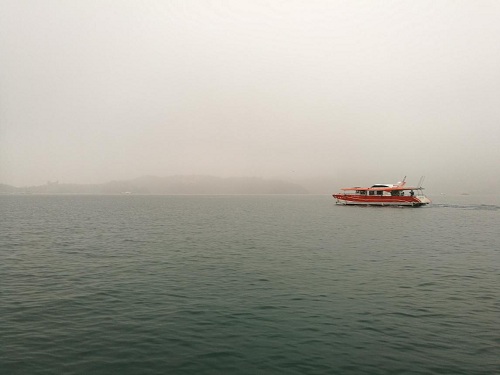 乘舟泛游在日月潭上,整条船都被淡淡的雾气包围着,仿佛是飘荡在仙雾云海之间缥缈虚幻。看着身边雾气中的美女感觉自己都变成守护在仙女旁边的童子了。放眼远望,山间有湖,湖畔有山,那远处的云雾并不是漫天分散一动不动,而是一缕两缕地从这座山中飘出再向那座山飘去,在中间与碧波相接。这使我想起了电视中观音所居住的南海仙境,再加上与偶尔缓缓驶过的邮轮相映衬,这真真儿是在电视剧上都难以找到的唯美艺术大作啊!