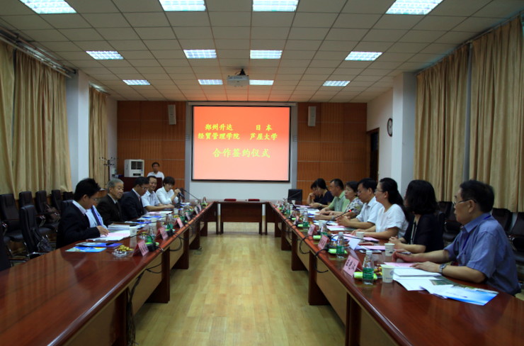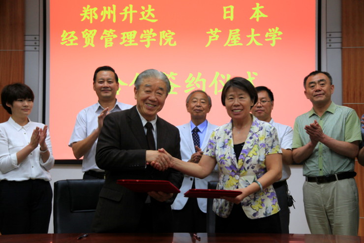 8月24日下午,我院与日本芦屋大学签订了《合作交流备忘录》。石井亮一理事长、郭爱先院长分别代表双方签字。第九届河南省政协副主席、原郑州市市长、河南省中华文化促进会主席陈义初、副主席兼秘书长王武伟、郑州师范学院副院长蒋丽珠、河南省华夏文化发展基金会秘书长孟庆国等共同出席并见证了合作双方的签字仪式。