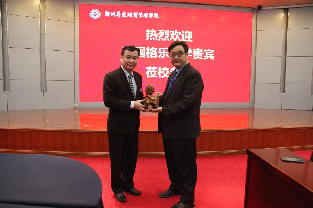 3月26日上午,泰国格乐大学国际学院院长陈秋生、中国事务中心主任经亚磊、河南事务中心主任杨书迪、河南事务教务主任蒋冲一行4人访问我校,我校执行董事王新奇博士、党委副书记戎庭银、副校长吴益民会见了来访客人,发展规划处处长沈定军、外事办主任顿雁峰参加了会见。