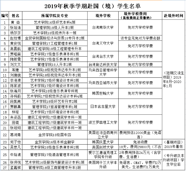 我校学生2019年秋赴美国、英国、波兰、韩国、日本、马来西亚及赴台湾等高校交流选拔工作已结束。学生选拔由各二级学院推荐,经教务处、学务处、宣传部、外事办审核及面试,选定27名学生赴国(境)外交流,名单如下【具体赴国(境)外事宜以最终成行为准】: