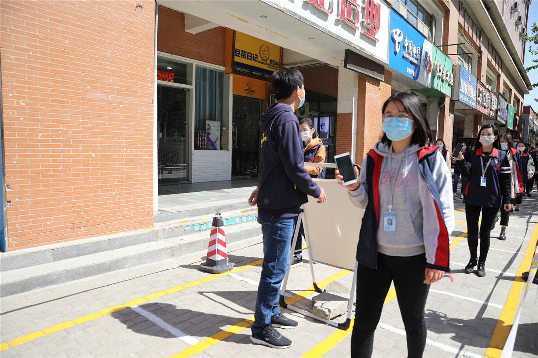 “学生”报到后进入校园,依次排队返回宿舍。沿途工作人员督促“学生”按照预定路线返回宿舍,间隔1.5米以上距离,严禁在校园内闲逛。