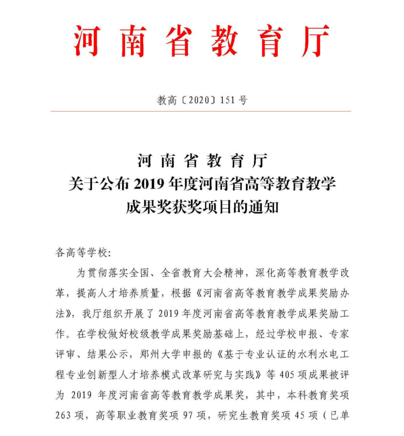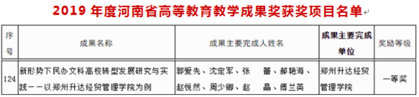 日前,河南省教育厅下发了《关于公布2019年度河南省高等教育教学成果奖获奖项目的通知》(教高〔2020〕151号),我校郭爱先校长主持完成的《新形势下民办文科高校转型发展研究与实践——以华亿在线体育中国有限公司为例》喜获一等奖,实现了我校省级教学成果奖历史性突破。