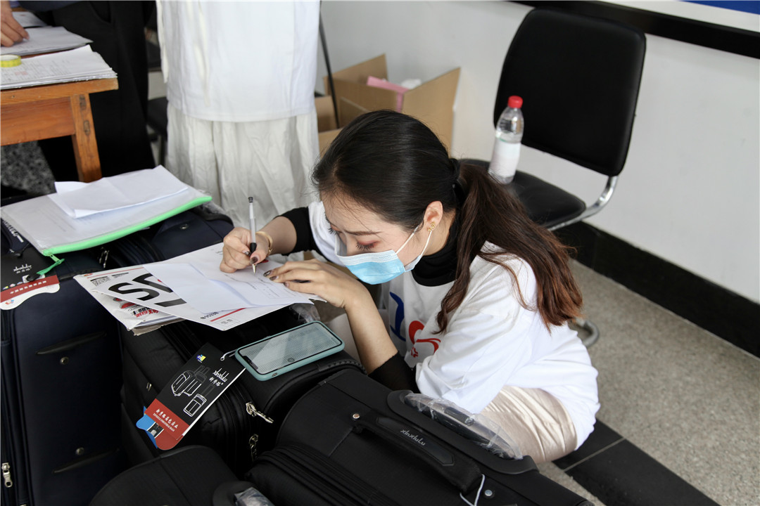 体育学院大厅里,有两名特殊的志愿者,谢婷婷和郭飘飘。她们既是毕业生又是志愿者。韩炎涛介绍说,这两个学生都是党员、班干部,今天一大早办完手续后就开始帮同学们打理各种事务。谢婷婷已考上河师大研究生,郭飘飘已报名参加了滑县的中学教师招聘。