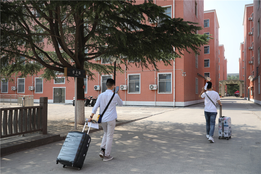 (“回家”毕业生有序排队至宿舍管理人员处办理入住登记)