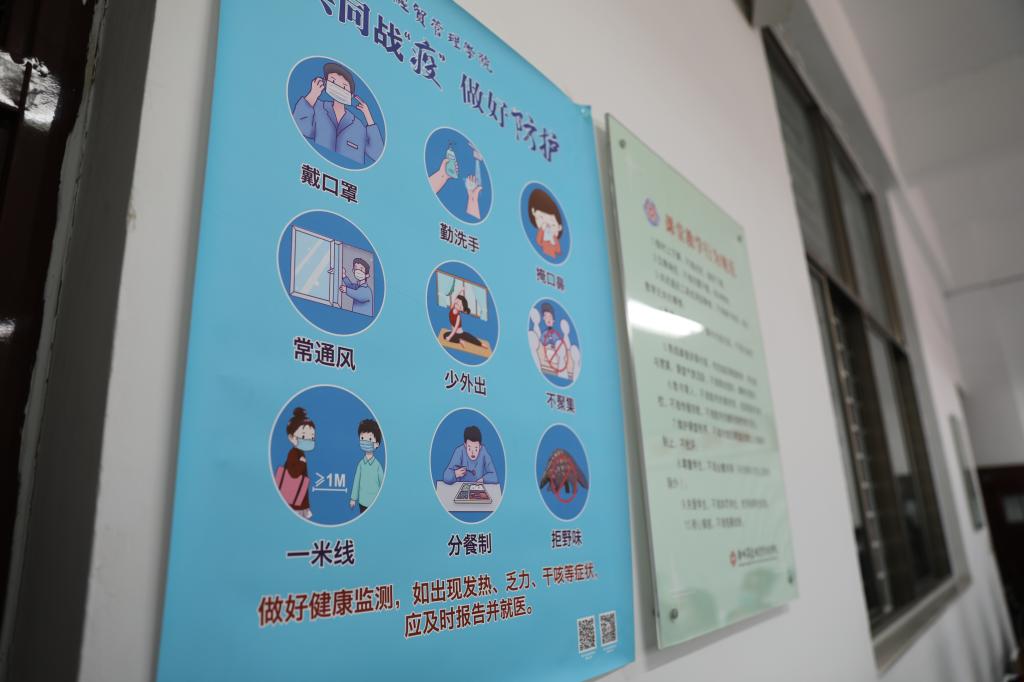 学生进入宿舍前,辅导员、宿舍管理人员为返校学生办理入住登记、测量体温,并提醒同学们开窗通风、勤洗手,出入戴好口罩等。宿舍工作人员依次为学生检测体温、喷射消毒洗手液,对学生行李箱及随身物品进行消毒,核实入住学生身份信息后方可进入宿舍。宿舍内悬挂了防疫科普知识展板,张贴了安全疏散示意图、应急处置流程图、错峰洗漱提示语等。公共区域有针对性地进行了通风消杀,工作人员分工明确、密切协同,将每一个环节落实到位。