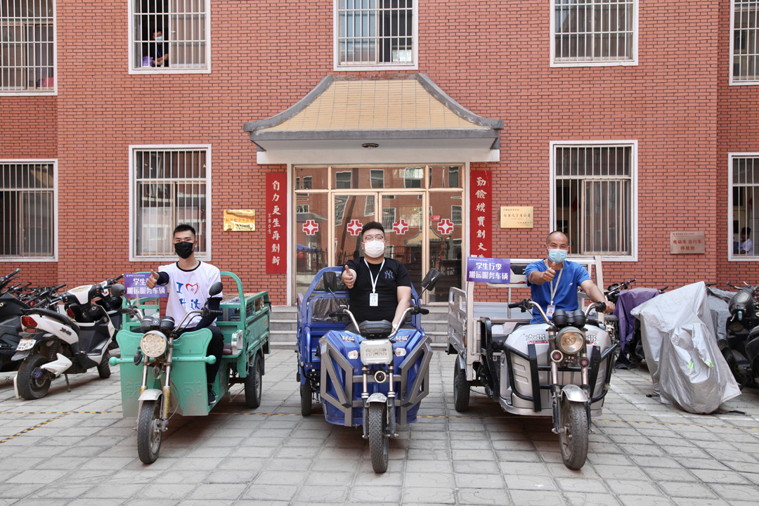 (志愿者老师驾驶三轮车为“回家”毕业生搬运行李)