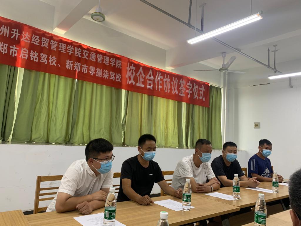 7月10日上午9点,在升达实训大楼518教室,交通管理学院举行了与启铭驾校、零捌柒驾校的校企合作签字仪式。参加仪式的双方领导有:启铭驾校、零捌柒驾校董事长周峰先生;启铭驾校校长于鑫先生;零捌柒驾校校长刘新伟先生;常务副校长郭顺先生;总教练岳渊浩先生。我校副校长吴益民;交通管理学院党总支书记韩炎涛同志;校地合作处王彦雨科长;交通管理学院教研室主任陶金仓副;交通管理学院辅导员朱帅老师;空乘专业教师李梦老师。仪式由交通管理学院教学秘书王凯老师主持。