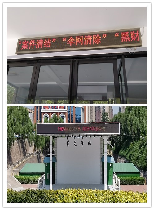 (电子显示屏滚动播放“扫黑除恶”标语)