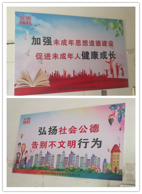 近日,我校在新郑市阳光港湾小区主干道两侧、草坪、楼道等处,安装社会主义核心价值观景观、公益广告牌、温馨提示牌和展板。这些景观、公益广告牌、温馨提示牌和展板涵盖了十九大精神、习近平新时代中国特色社会主义思想、培育和践行社会主义核心价值观、讲文明树新风、学雷锋志愿服务、家风传承、遵德守法、文明健康、疫情防控等丰富内容。