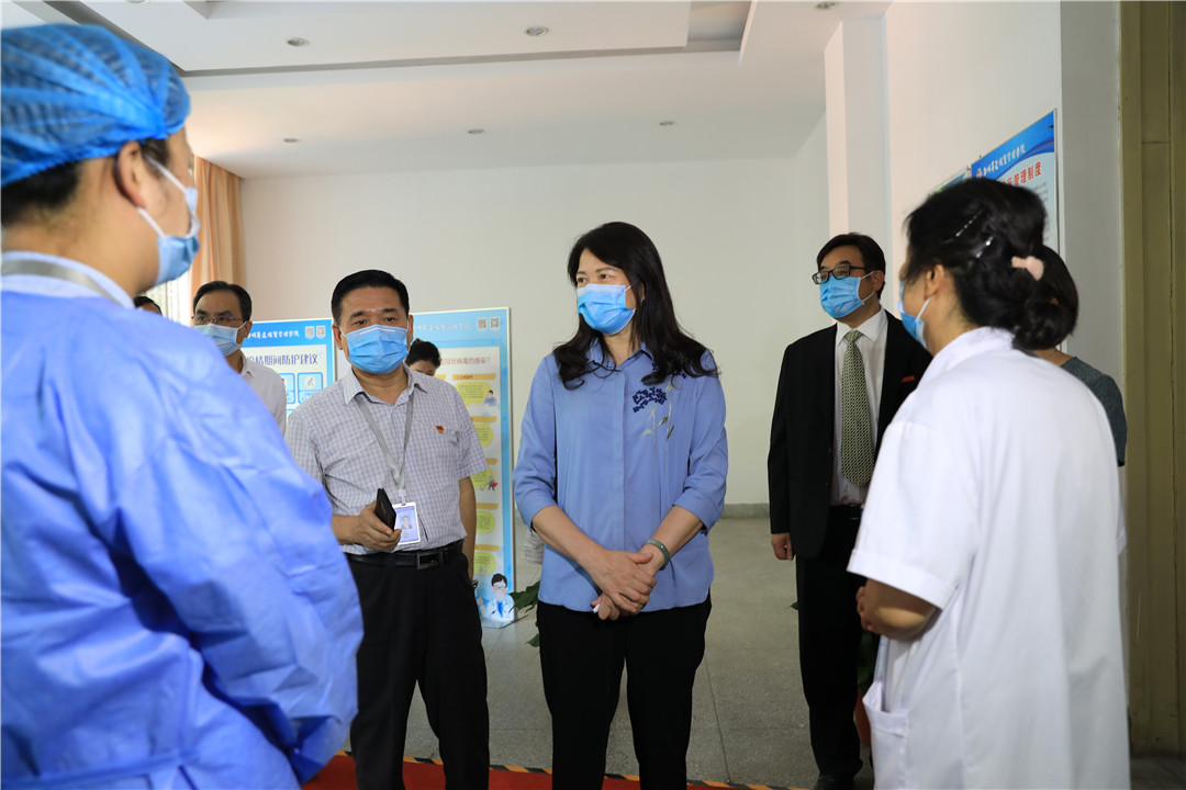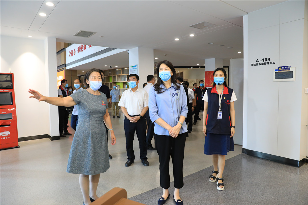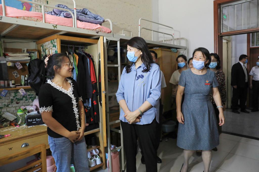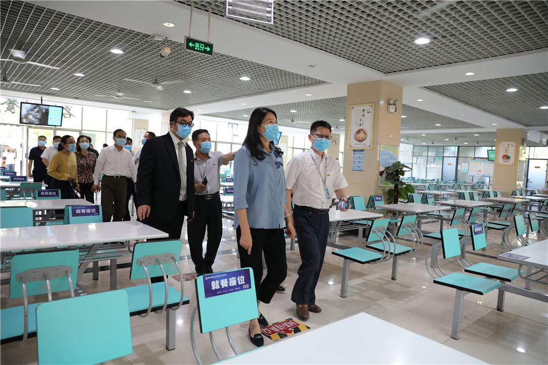 霍金花副省长先后深入学校学生返校专门通道、茗羽餐厅、疫情防控物资储备专用仓库、发热处置隔离区、学生宿舍、综合实训大楼、教学楼等场所,并参观了校史馆。“今天来了多少学生?”“行李要消毒吗?”“餐具是自己带的吗?”“食材和商品进货渠道怎么管理?”“防疫物资筹备够不够?”“医护人员有多少人?”“同学,你是哪里人?”“你们几个人一个房间?”“准备考研吗?”……霍金花副省长一边仔细查看,一边同师生、工作人员亲切交谈,详细了解师生返校、重点场所疫情防控、安全管理、开学第一课、防疫培训、防控物资设施储备以及校医和卫生专业人员配备等学校开学准备工作的各项具体措施、应急预案情况。