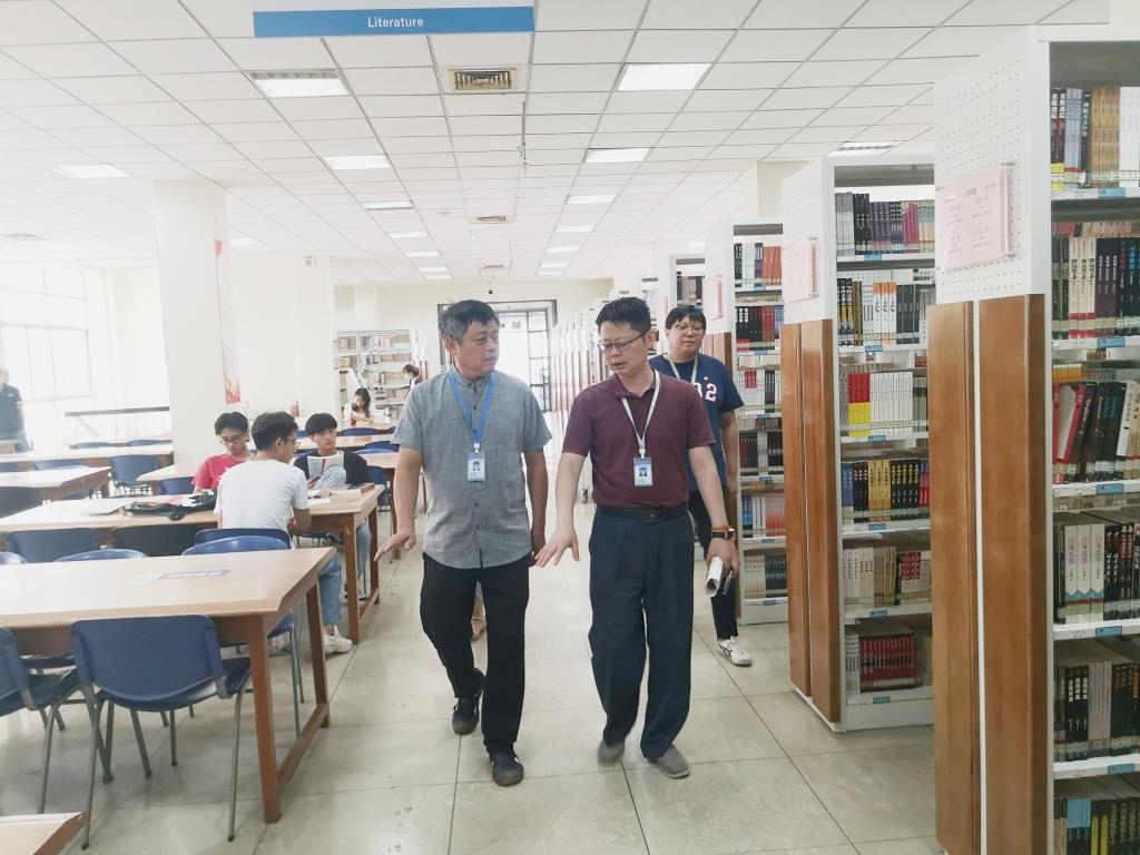常态化疫情防控复学复教以来,图书馆如何有序开放服务?图书馆内读者学习情绪和学习环境怎样?所有这些都一直牵动着学校领导的心思。9月15日上午,张其武副校长与总务处赵阳老师一起来到图书馆检查指导工作。