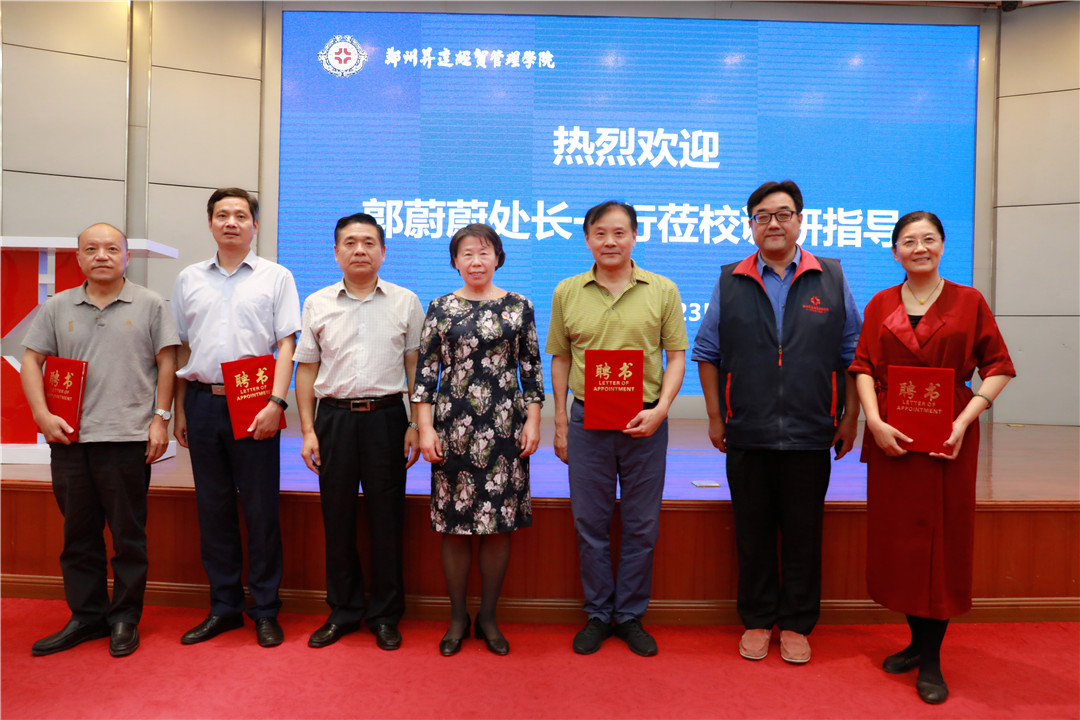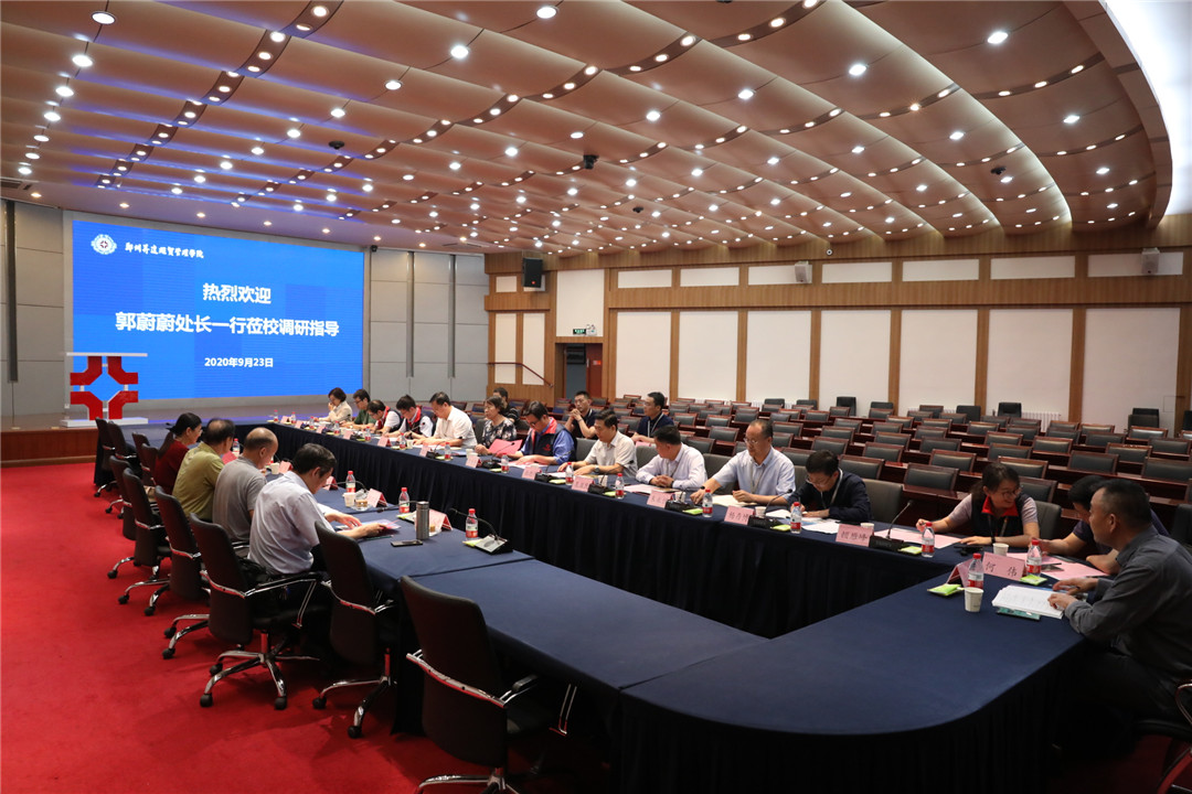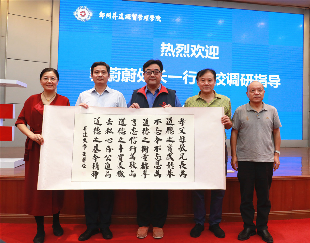9月23日下午,省教育厅体卫艺处原处长郭蔚蔚,中原工学院国教院院长、教授、省教育国际交流协会常务副秘书长孙玮,郑东新区教体局局长田国安,省教育厅对外合作处二级调研员、河南省教育国际交流协会副秘书长陈兆武一行四人莅校考察指导。我校执行董事王新奇、校长郭爱先、校党委书记张德伟、副校长兼工会主席张金安、副校长兼教务长吴益民、副校长兼总务长张其武及相关部门主管在国际会议厅接待来访贵宾。