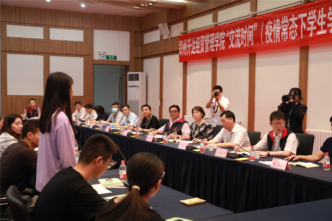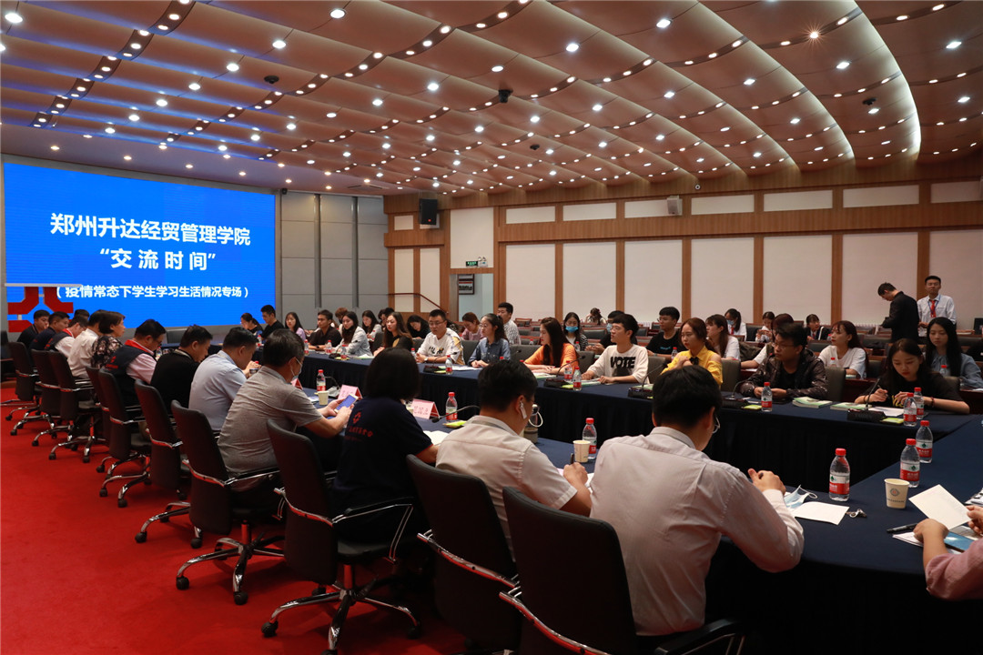 9月24日下午,我校在行政楼国际会议厅就疫情常态下学生的学习、生活情况举办“交流时间”专场。执行董事王新奇、校长郭爱先、副校长兼工会主席张金安,副校长兼教务长吴益民、副校长兼总务长张其武、董事会办公室秘书兼科研处处长杨存博,以及学务、图书馆、教务、校团委等有关部门负责人参加了“交流”。这次参加交流的30多名学生皆来自各学院大二至大四的学生代表。本次“交流时间”由校党委书记张德伟主持。