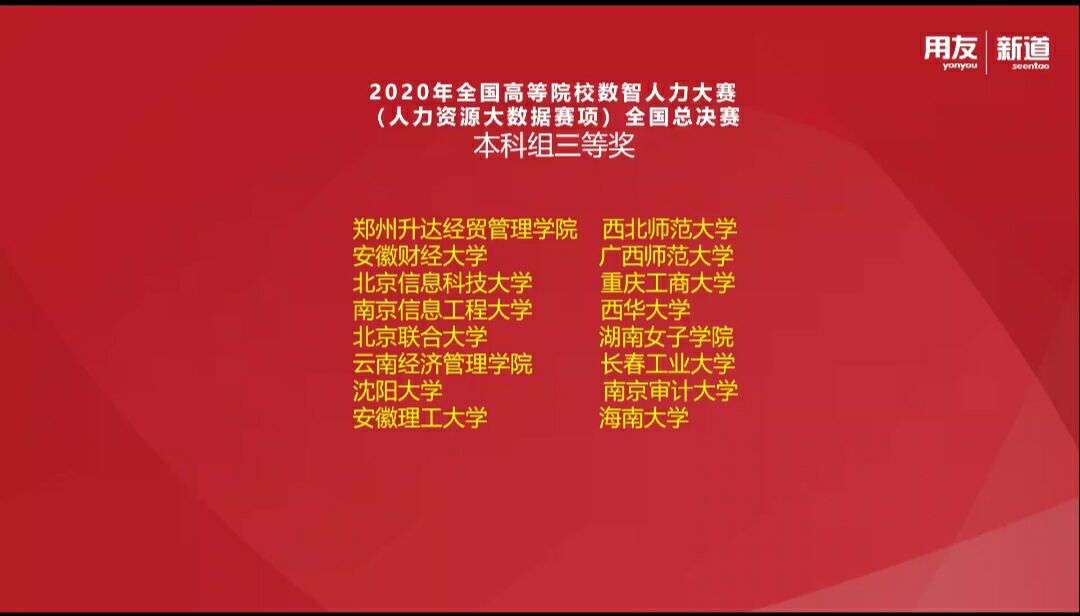 2020数智人力全国总决赛于11月20日通过线上形式在新道DBE人力资源大数据分析实践教学平台举行,管理学院人力资源管理专业四名学生杨可可、温晓丹、陈杰、邓文静代表我校参加了本次比赛。