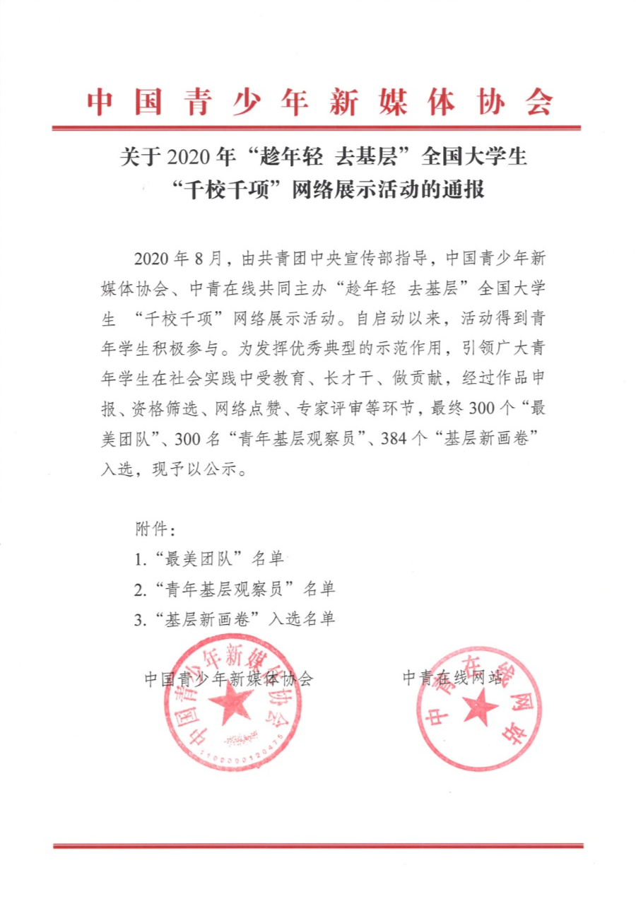 名单公示:“趁年轻 去基层”2020全国大学生“千校千项”网络展示活动