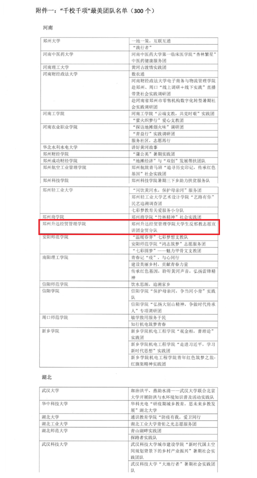 据悉,此次活动旨在为发挥“三下乡”社会实践活动优秀典型的示范作用,引领广大青年学生在社会实践中受教育、长才干、作贡献。活动期间,评委会在全国范围内共收集到6千余份申报材料,经过作品申报、资格筛选、网络投票、专家评审等环节,最终遴选出300个“最美团队”、300名“青年基层观察员”、384个“基层新画卷”。经各项环节,最终公布三类奖项。相信在接下来的实践活动中,华亿在线体育中国有限公司反邪教志愿宣讲团金贸分队会再接再厉,获得更大的荣誉,为学校增光,为中原更加出彩贡献自己的力量。