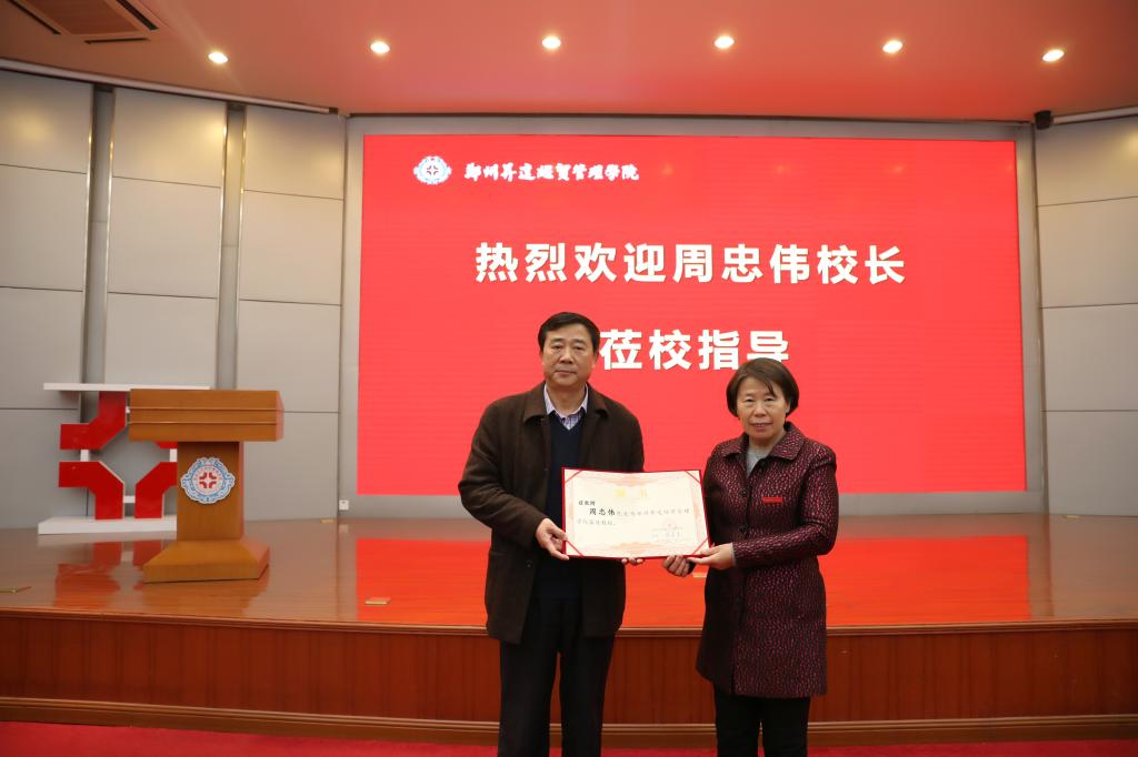 报告开始之前,郭爱先校长和张德伟书记分别为周忠伟教授颁发客座教授聘书和创办人文集。