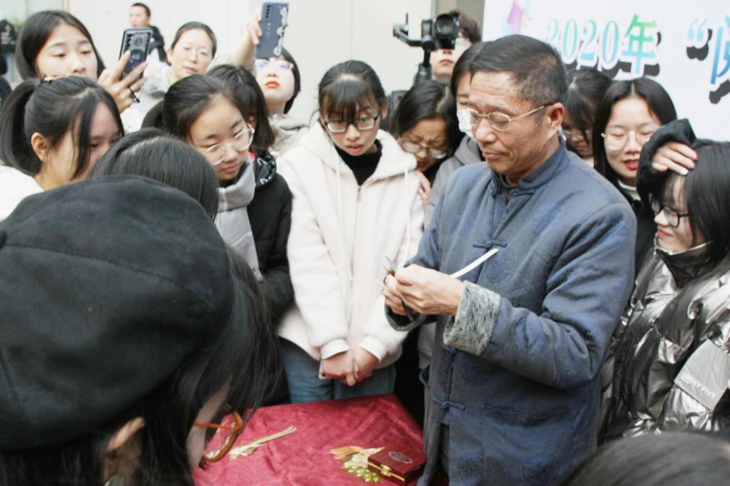 仪式现场的另外一边,陈振强大师表演麦秸画制作工艺现场人头躜动,老师和同学们都争先恐后地认真观摩品味,亲眼目睹了麦秸画的“蝶变”过程,无不为陈大师精湛的麦秸画制作工艺所折服,为中国优秀非遗传统文化深感自豪。
