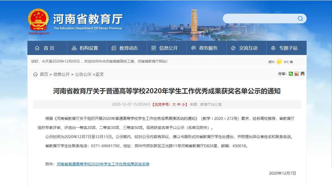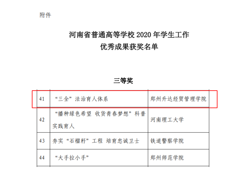 近日,从河南省教育厅办公室《河南省教育厅关于组织开展2020年普通高等学校学生工作优秀成果展演活动的通知》(教学﹝2020﹞272号)中获悉,我校文法学院“三全”法治育人体系项目在2020年河南省普通高等学校学生工作优秀成果评比中荣获三等奖。
