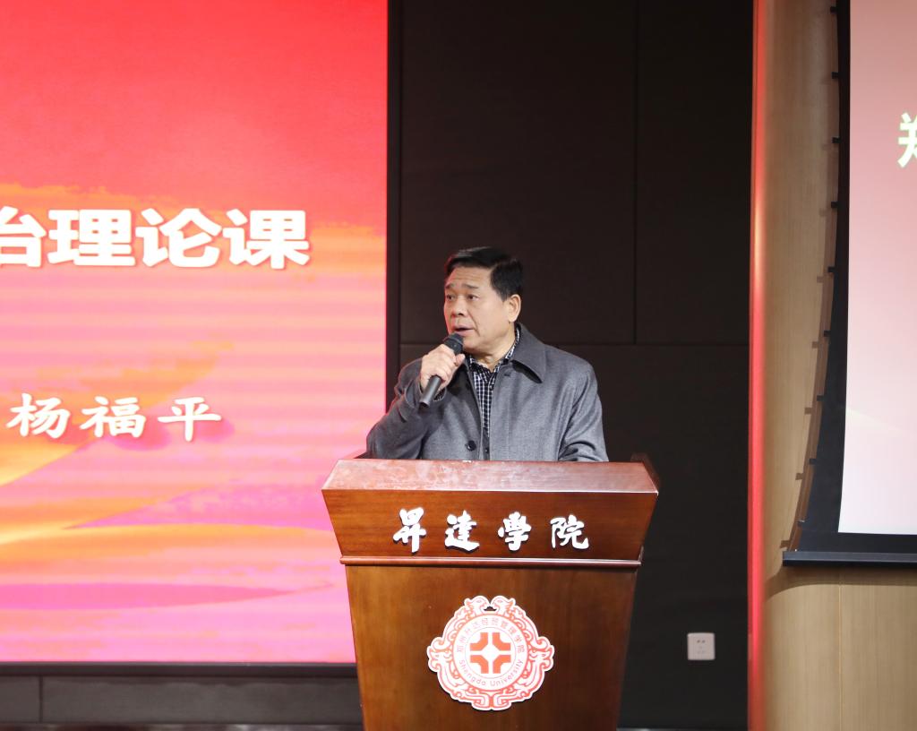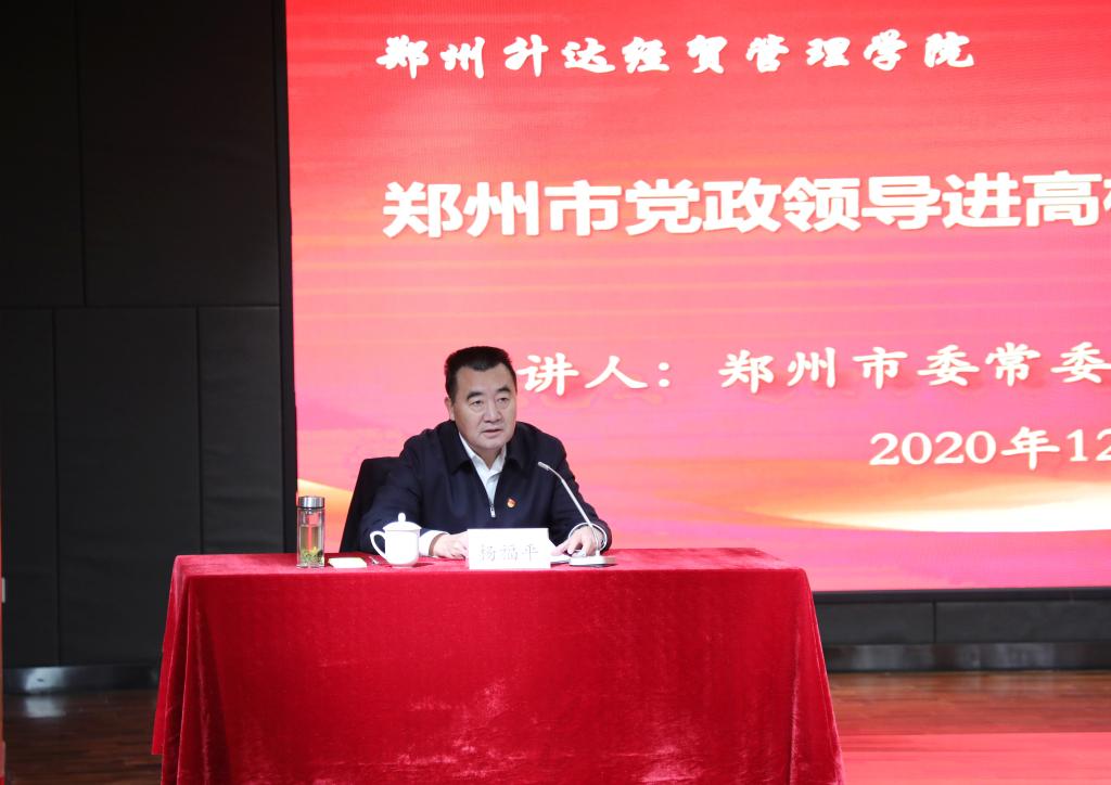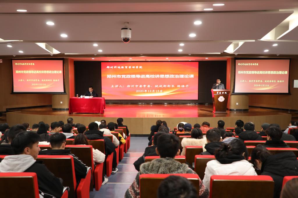 近日,为深入贯彻落实全国全省高校思想政治工作会议精神和习近平总书记在学校思想政治理论课教师座谈会上的重要讲话精神,根据郑州市委统一安排,郑州市委常委、统战部部长杨福平在我校双创大讲堂为师生讲授思想政治理论课。校党委书记张德伟主持。