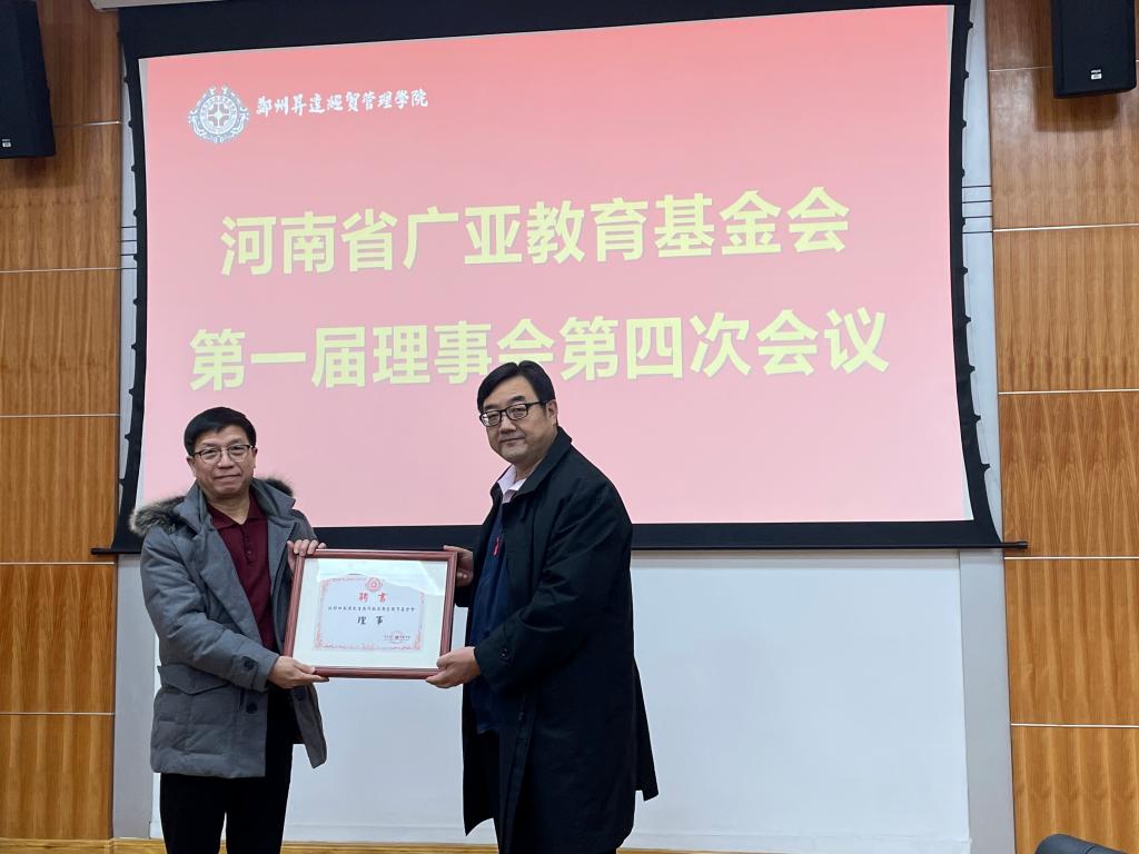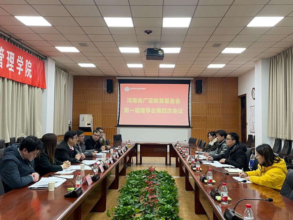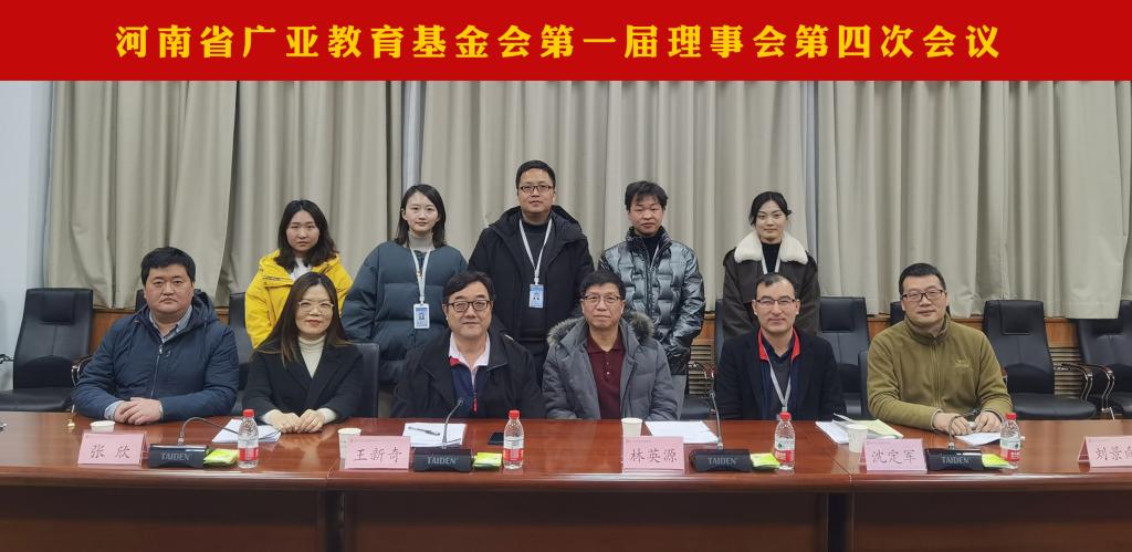 2020年12月16日下午,河南省广亚教育基金会第一届理事会第四次会议在我校行政楼第二会议室召开。基金会名誉理事长王新奇、郑州市台商协会副会长林英源、理事长张欣、常务副理事长沈定军、理事刘景向、冯亚飞参加本次会议。会议由基金会秘书长刘昊主持。