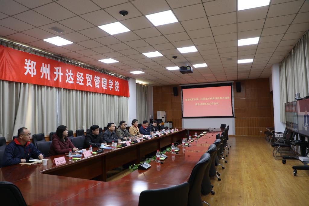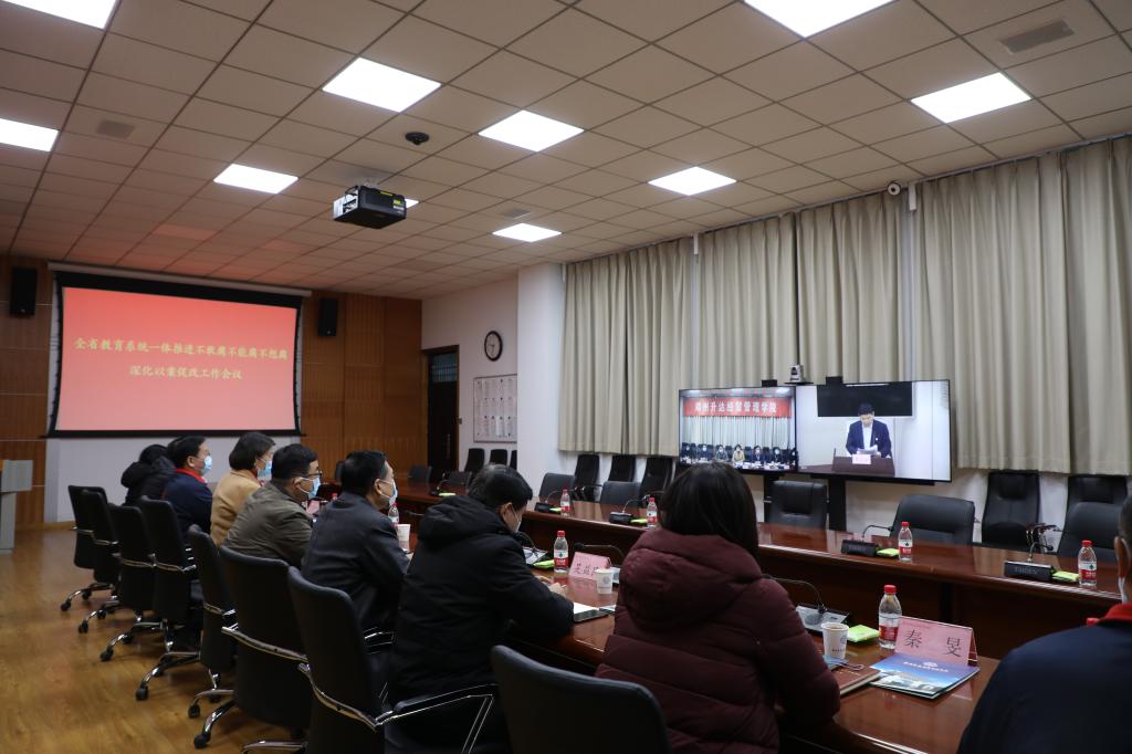 为深入贯彻落实省委一体推进不敢腐不能腐不想腐深化以案促改工作会议精神,总结全省教育系统集中开展以案促改工作成效,推进以案促改工作制度化常态化开展,12月21日上午,河南省委高校工委、河南省教育厅通过视频会议形式召开了全省教育系统一体推进不敢腐不能腐不想腐深化以案促改工作会议。会议以视频方式在省主会场、各分会场同步召开,我校执行董事王新奇、校长郭爱先、党委书记张德伟、副校长张金安、副校长吴益民、副校长张其武、党办主任秦旻、校办主任朱永恒、纪委副书记袁征在行政楼第二会议室分会场参加了会议。