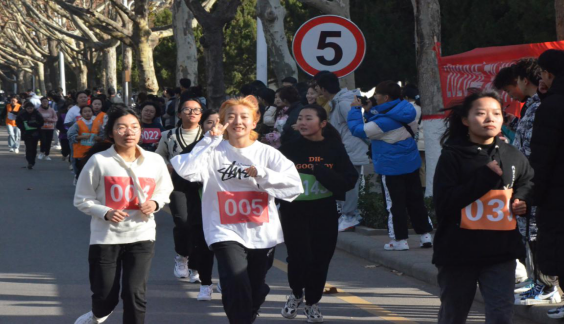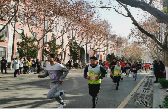 长跑比赛在校园主干道上进行,道路两旁悬挂着一条条各学院的宣传与助威标语。下午两点,天气依旧寒冷,但冷却不了大家的参赛热情。伴随着阵阵的加油声,运动员们各个身姿矫健,英姿飒爽。