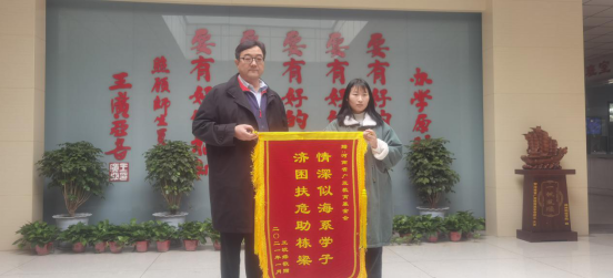 人间自有真情在,爱心资助暖人心。2021年1月4日,商学院王皎蝶同学怀着感恩的心将亲手写的感谢信和“情深似海系学子 济困扶危助栋梁”锦旗送到我校执行董事兼河南省广亚教育基金会名誉理事长王新奇博士手中,以表达她对学校董事会和河南省广亚教育基金会救助的感激之情。