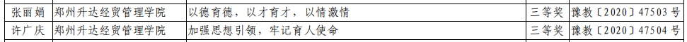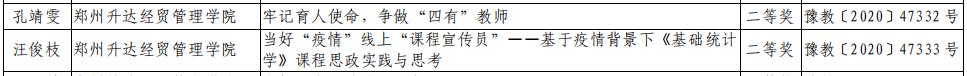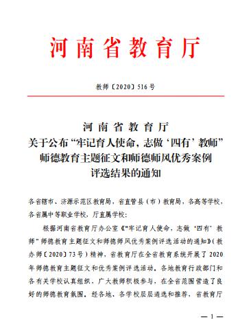 近日,省教育厅下发了《关于公布“牢记育人使命,志做‘四有’教师”师德教育主题征文和师德师风优秀案例评选结果的通知》,我校孔靖雯、汪俊枝、张丽娟、许广庆四位老师的作品在此次评选活动中获奖。其中,孔靖雯老师的《牢记育人使命,争做“四有”教师》和汪俊枝老师的《当好“疫情”线上“课程宣传员”——基于疫情背景下<基础统计学>课程思政实践与思考》荣获二等奖,张丽娟老师的《以德育德,以才育才,以情激情》和许广庆老师的《加强思想引领,牢记育人使命》荣获三等奖。