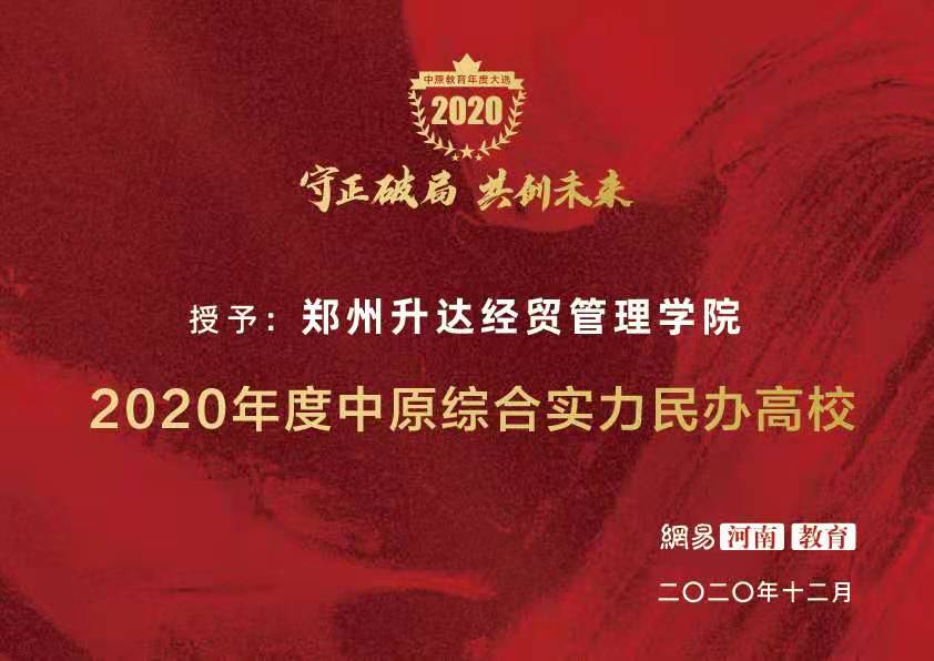 网易在2020年终评选中,我校在众多高校中脱颖而出,被评为“2020年度中原综合实力民办高校”荣誉称号,并授予执行董事王新奇博士“2020年度中原教育行业态度人物”荣誉称号。