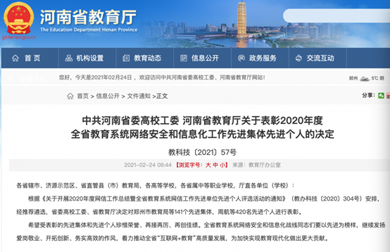 近日,中共河南省委高校工委、河南省教育厅联合发布《关于表彰2020年度全省教育系统网络安全和信息化工作先进集体先进个人的决定》,我校被评为2020年度全省教育系统网络安全和信息化工作先进集体,副校长兼总务长张其武、信息化办公室主任李保华被评为全省教育系统网络安全和信息化工作先进个人。