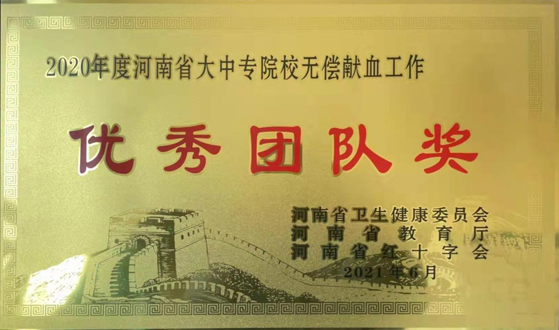 近日,河南省卫生健康委员会、河南省教育厅、河南省红十字会联合发布《关于表扬2020年度河南省大中专院校无偿献血工作先进集体和先进个人的通报》,对2020年度河南省大中专院校中涌现的无偿献血工作先进集体和个人进行集中表扬。我校荣获“无偿献血优秀团队奖”;校团委职工孔靖雯、校青年志愿者协会学生刘梦瑶荣获“无偿献血先进个人奖”。
