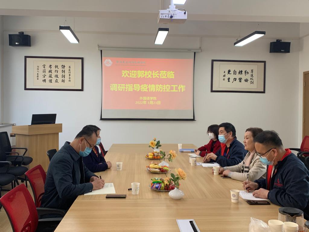 3月23日上午,校长郭爱先在校办主任朱永恒的陪同下,莅临外国语学院调研指导疫情防控工作。外国语学院院长张梦、党委书记石皓召、教学秘书祁胜利、行政秘书丁玥参加此次调研。
