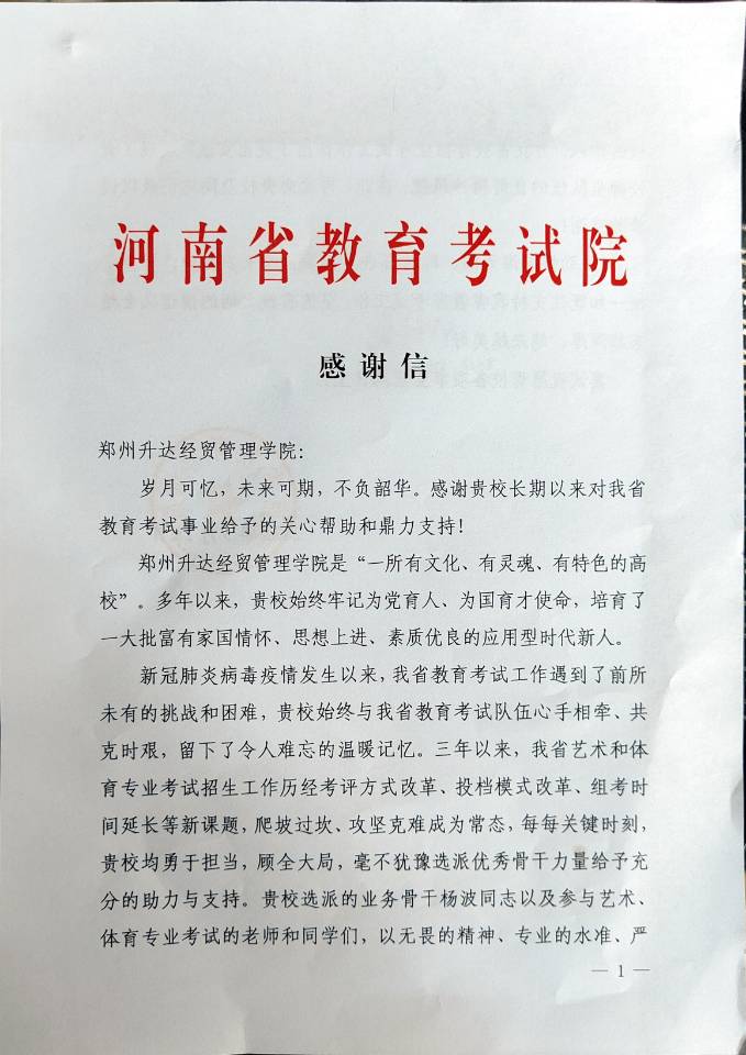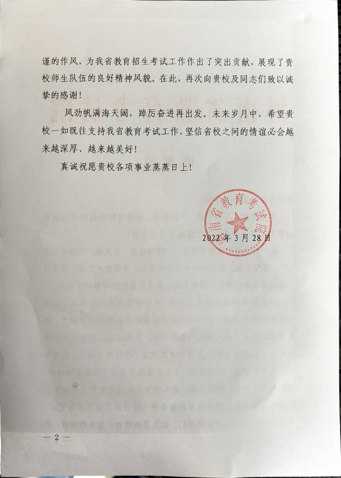 近日,我校收到河南省教育考试院的感谢信。在信中省教育考试院对我校长期以来对河南省教育考试事业给予的帮助和支持表示感谢,同时也祝愿我校各项事业蒸蒸日上。