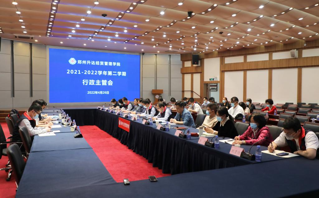4月26日下午,我校在行政楼国际会议厅召开2021-2022学年第二学期第二次行政主管会。执行董事王新奇,校长张欣,副校长、工会主席张金安,副校长兼教务长吴益民,副校长兼总务长张其武和各职能部门主管,各二级学院院长参加了会议,名誉校长郭爱先因公务在外未出席会议,会议由张欣主持。