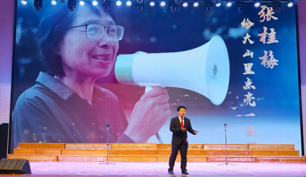 “建校10多年来,她累计把近2000名女孩送入大学,点亮她们的人生梦想。学生亲切地称她‘张妈妈’。建校10多年来,她走过11万多公里的家访路,走进1000多名学生的家。她虽然因小脑萎缩导致行动失衡,却跋山涉水坚持家访……在张桂梅看来,女高不是普通的学校,是连接党委政府和山区贫困群众的桥梁。”金贸学院的李睿锟同学为大家深情地讲着时代楷模——张桂梅的故事。正是张桂梅她们的坚持不懈、不离不弃,幸福路上不让任何一个人掉队,这就是中国精神最好的体现。