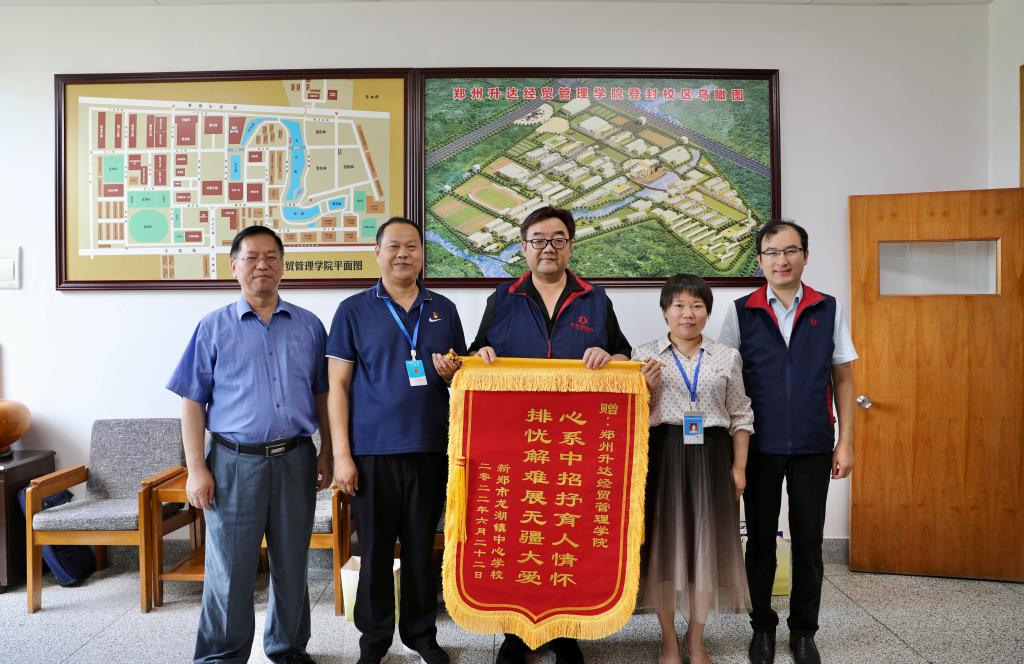 6月22日上午,新郑市龙湖镇副镇长王俊艳一行莅临我校专程送锦旗表感谢,受到学校领导执行董事王新奇,校党委副书记、副校长、工会主席张金安,发展规划处处长沈定军等同仁的热情接待。